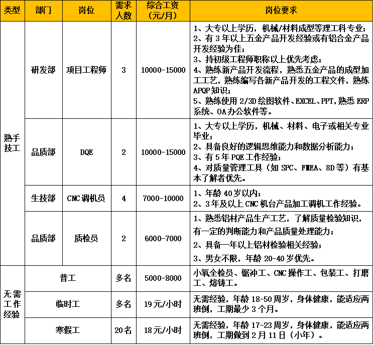 公司擁有廣東省唯一的鋁車體工程技術(shù)研究中心。“鈦美鋁材”品牌先后獲得鋁型材行業(yè)內(nèi)的最高榮譽(yù):“中國(guó)馳名商標(biāo)”、“中國(guó)著名品牌”、“中國(guó)名優(yōu)產(chǎn)品”;公司榮獲“國(guó)家高新技術(shù)企業(yè)”、廣東省“專精特新”企業(yè)等榮譽(yù)稱號(hào)。因生產(chǎn)發(fā)展需要,誠聘以下崗位: