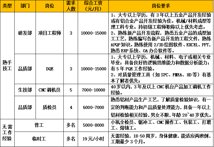 公司擁有廣東省唯一的鋁車體工程技術(shù)研究中心。“鈦美鋁材”品牌先后獲得鋁型材行業(yè)內(nèi)的最高榮譽:“中國馳名商標(biāo)”、“中國著名品牌”、“中國名優(yōu)產(chǎn)品”;公司榮獲“國家高新技術(shù)企業(yè)”、廣東省“專精特新”企業(yè)等榮譽稱號。因生產(chǎn)發(fā)展需要,誠聘以下崗位: